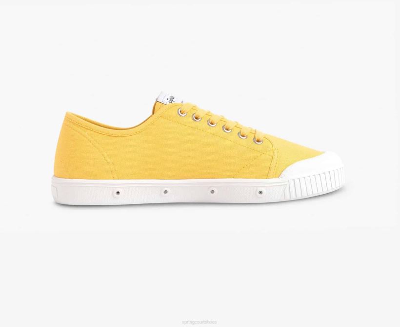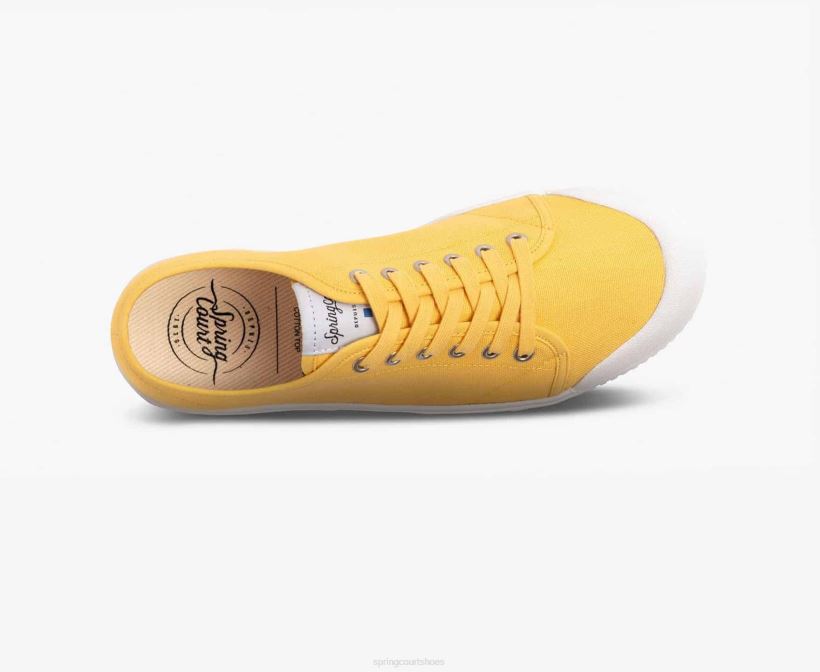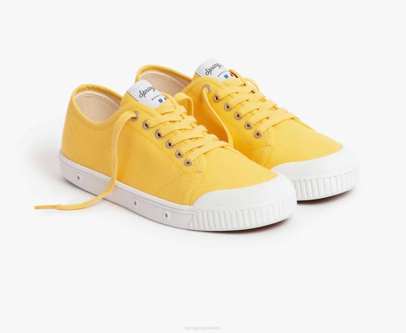The colourful mimosa yellow canvas upper highlights the bold lines of our tennis shoe with its ventilated rubber sole.
